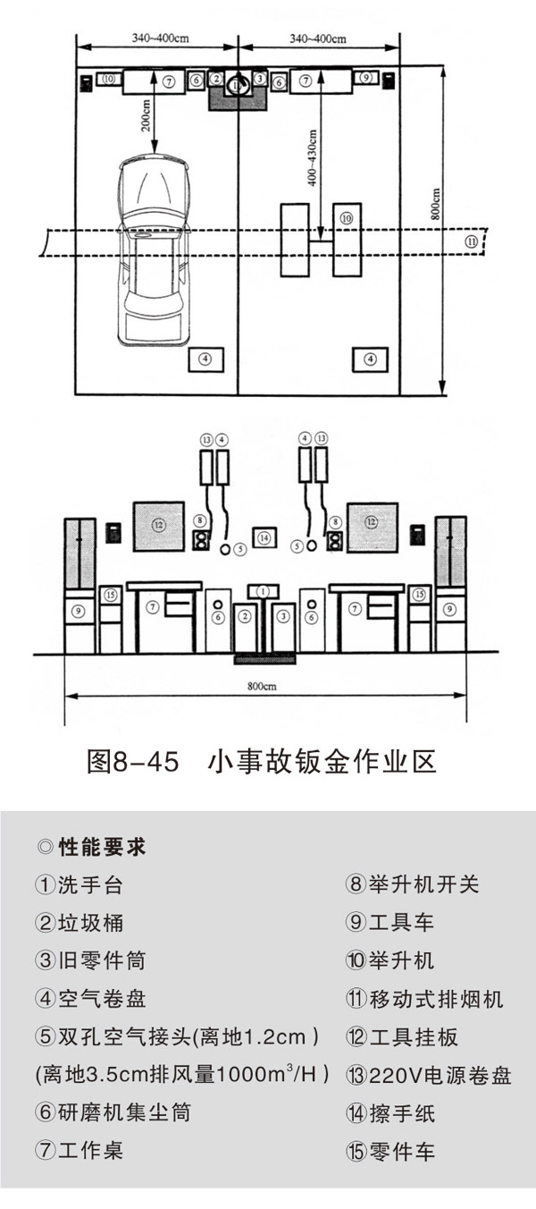 小事故作業(yè)區(qū)視維修業(yè)務(wù)量安排2~4個(gè)工位,每個(gè)工位設(shè)備設(shè)施齊全,能獨(dú)立完成板件損傷修復(fù)。