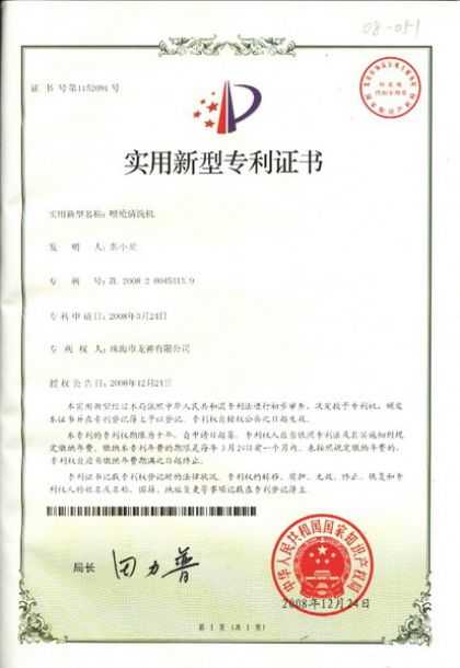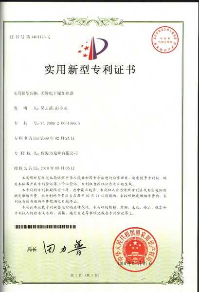 ![]() 噴槍清洗機(jī)專利證書 | ![]() 無靜電干燥加熱器專利證書 |