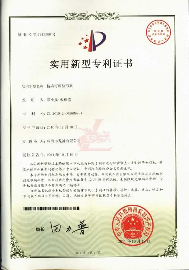 精確可調(diào)整形架專利證書 |