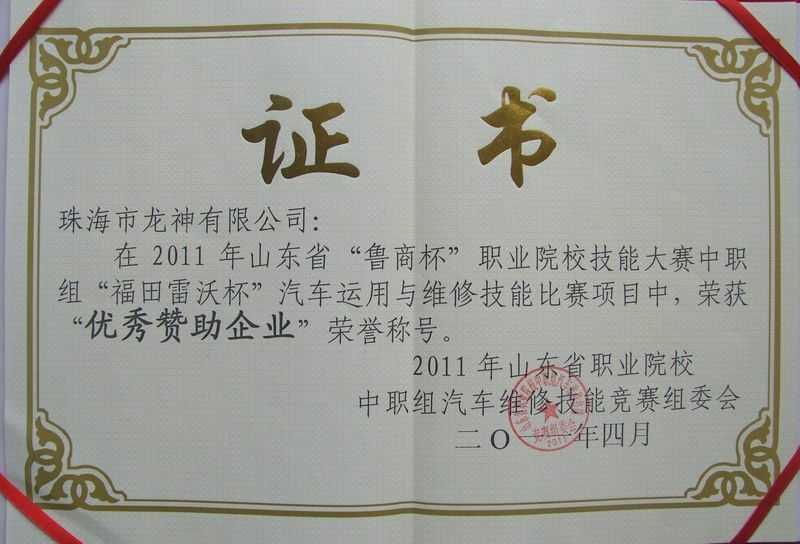 4月7日,在「2011年山東省“魯商杯”職業(yè)院校技能大賽」中職組“福田雷沃杯”汽車運用與維修技能大賽項目中,我司榮獲“優(yōu)秀贊助企業(yè)”榮譽稱號。